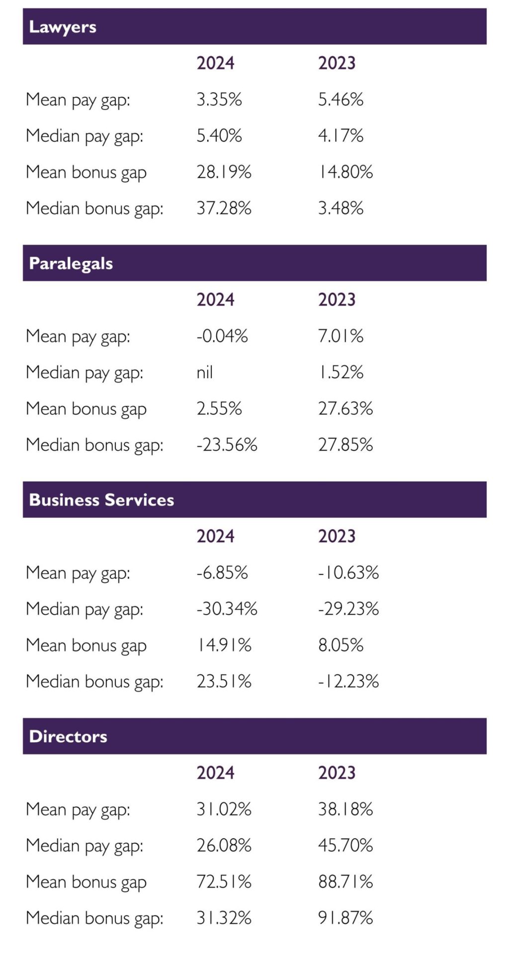 We have broken down our analysis into the different employee groups within the firm: lawyers, paralegals, business services and directors.