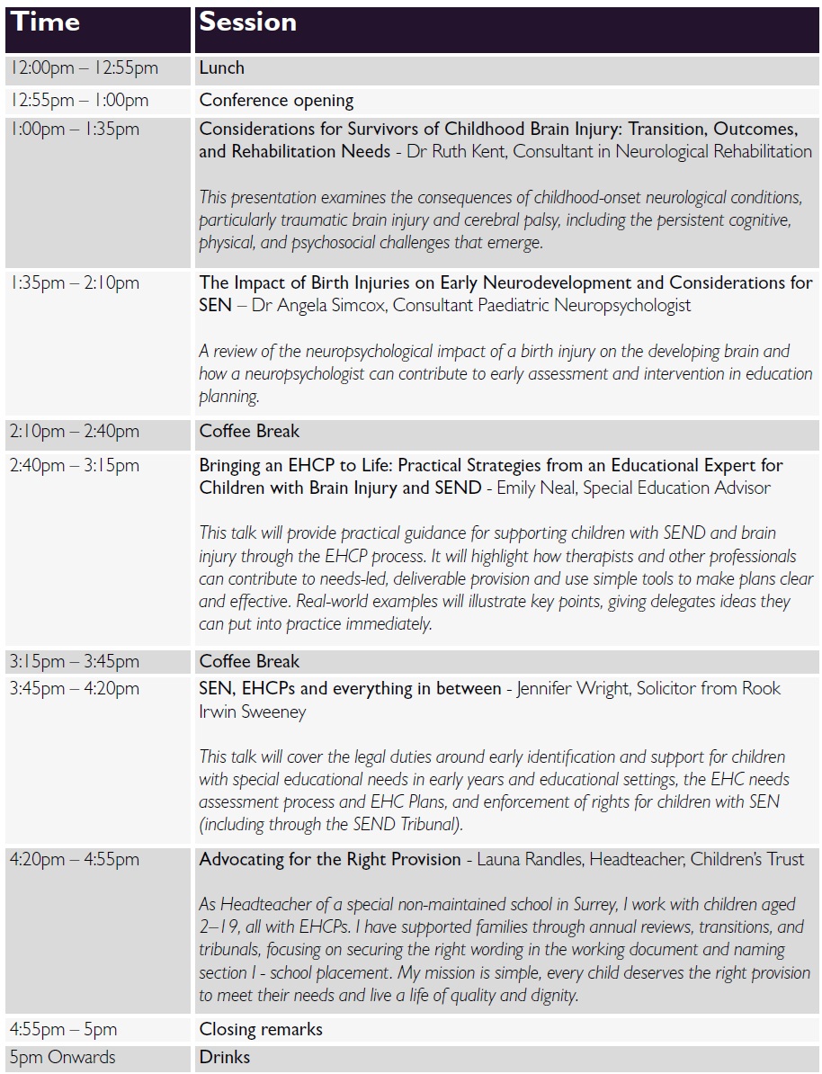 This conference is designed for parents, carers and healthcare professionals who support children during the critical early years of development. Attendees will gain valuable guidance on navigating the SEN system and securing appropriate EHCPs, with a focus on ensuring the best possible outcomes for children affected by birth-related brain injuries.